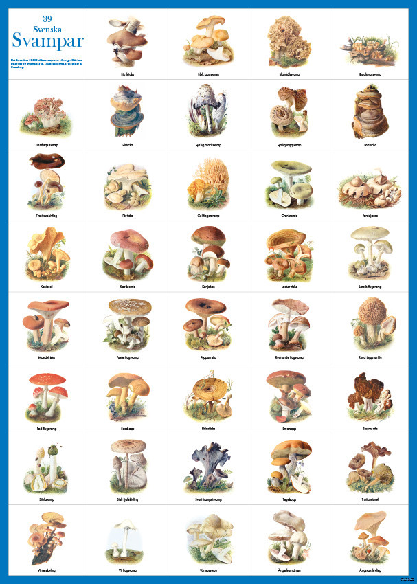 Denna affisch illustrerar 39 av Sveriges vanligaste svampar, med varje art noggrant avbildad och namngiven. Med måtten 50 x 70 cm är den ett utmärkt verktyg för både utbildning och dekoration i hem eller klassrum. Illustrationerna är gjorda av E. Gramberg.