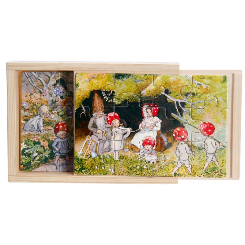 En trälåda med fyra träpussel, vart och ett med 12 bitar ca 12 x 17,5 cm i storlek, som illustrerar scener från Elsa Beskows klassiska berättelse "Tomtebobarnen". Motiven föreställer olika scener från "Tomtebobarnen", där små tomtebarn leker och utforskar skogen, omgivna av naturens rikedomar som svampar, träd och djur. Illustrationerna är detaljrika och färgglada.