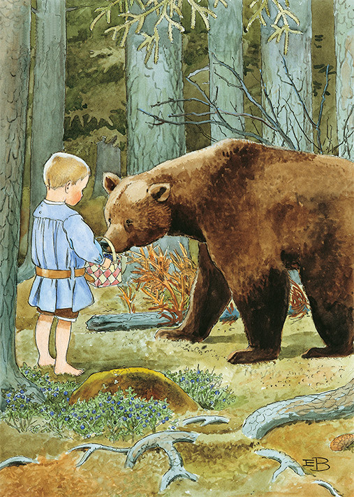 Denna affisch av Elsa Beskow illustrerar den klassiska barnvisan "Mors lilla Olle" med en charmig scen där Olle möter en björn i skogen. Med måtten 50 x 70 cm är den ett vackert tillskott till barnrummet eller som en nostalgisk detalj i hemmet.