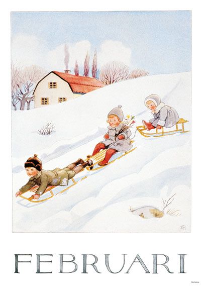 Illustrationen visar barn som åker kälke i ett snöklätt landskap, omgivna av vinterträd och en klar himmel, vilket framkallar en känsla av februaris kyliga men livfulla atmosfär. Detaljerna och färgpaletten speglar månadens speciella karaktär. Av Elsa Beskow.