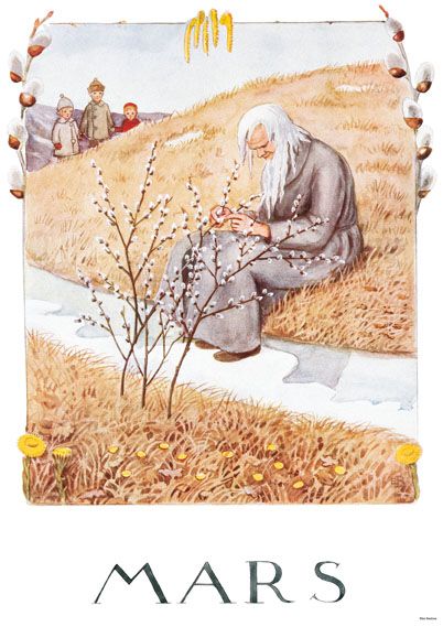 Illustrationen visar en äldre man som sitter på en kulle och binder videkvistar, medan barn leker i bakgrunden, omgivna av vårens spirande grönska och blommande videkissar. Denna scen framkallar en känsla av mars månads unika charm och naturens återfödelse. Detaljerna och färgpaletten speglar månadens speciella karaktär.