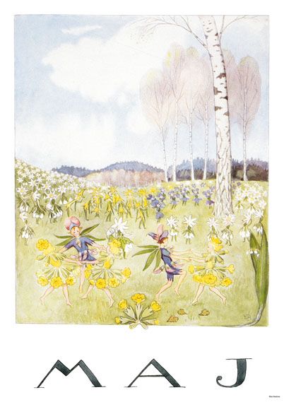 Illustrationen visar en förtrollande vårscen med blommande ängar och grönskande träd, där naturens rikedom och färgprakt framhävs. Denna bild framkallar en känsla av glädje och förnyelse som är typisk för maj månad. Detaljerna och färgpaletten speglar månadens speciella karaktär. Av Elsa Beskow.
