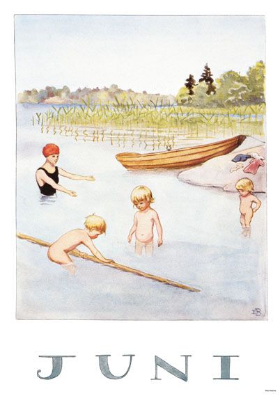 Illustrationen visar barn som leker och badar vid en sjö, omgivna av sommarens grönska och en klarblå himmel, vilket framkallar en känsla av junis livfulla och glädjefyllda atmosfär. Detaljerna och färgpaletten speglar månadens speciella karaktär. Av Elsa Beskow.