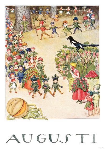 Illustrationen visar en livlig skördefest där naturens väsen och barn dansar tillsammans, omgivna av mogna frukter och grönska, vilket framkallar en känsla av gemenskap och glädje som är typisk för augusti månad. Detaljerna och färgpaletten speglar månadens speciella karaktär. Av Elsa Beskow.