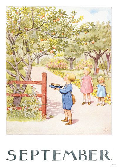 Illustrationen visar barn som plockar äpplen i en lummig trädgård, omgivna av mogna frukter och höstens varma färger, vilket framkallar en känsla av gemenskap och glädje som är typisk för september månad. Detaljerna och färgpaletten speglar månadens speciella karaktär. Av Elsa Beskow.