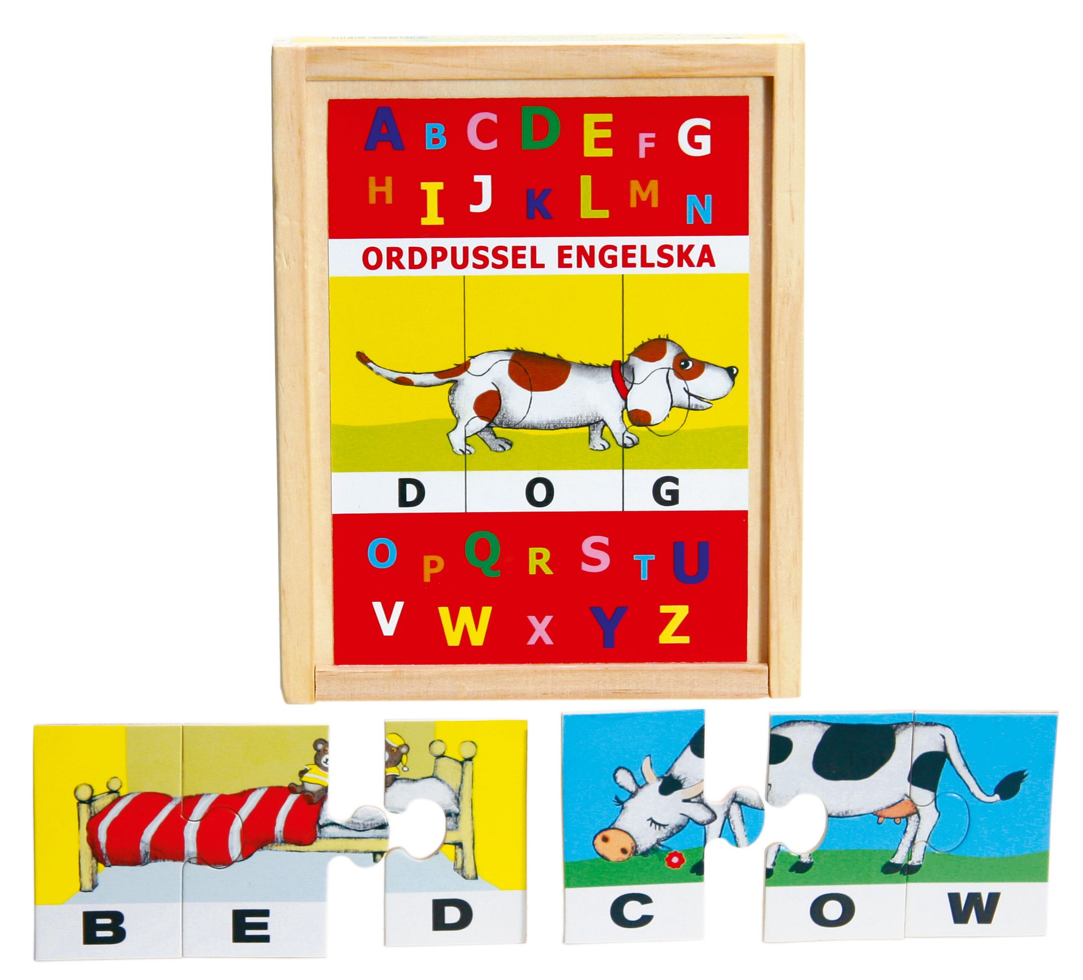 "Ordpussel engelskt" – ett träpussel med 30 bitar som tillsammans bildar 10 engelska ord. Illustrationer av Gun Jacobson. Ett pusselmotiv visar en hund som sträcker ut sig över flera pusselbitar. Varje pusselbit innehåller en bokstav, och när de sätts ihop bildar de engelska ord som "DOG". Illustrationerna är enkla och färgglada, vilket gör det lätt för barn att associera bokstäverna med rätt bild och ord. Denna visuella koppling mellan bild och text underlättar inlärningen av nya ord på engelska.