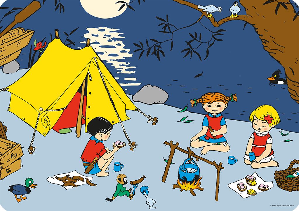Ett underlägg som skildrar Pippi Långstrumps äventyr när hon tältar. Mått: 42x29 cm. Perfekt för Pippi-fans och barn som älskar äventyr och utomhusaktiviteter. Astrid Lindgren © Ingrid Vang Nyman