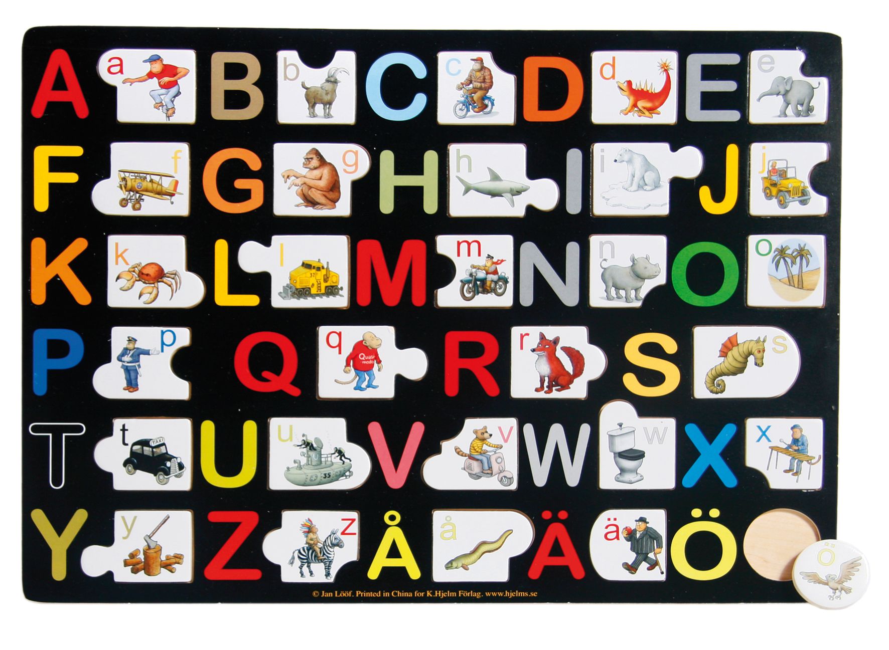 Gör bokstavsinlärningen rolig med "Lööf ABC-pussel". Detta träpussel mäter 30 x 40 cm och är illustrerat av den välkände Jan Lööf, känd för sina detaljrika och fantasifulla bilder. Genom att pussla ihop bokstäverna med tillhörande bilder får barnen en interaktiv upplevelse som underlättar inlärningen av alfabetet.