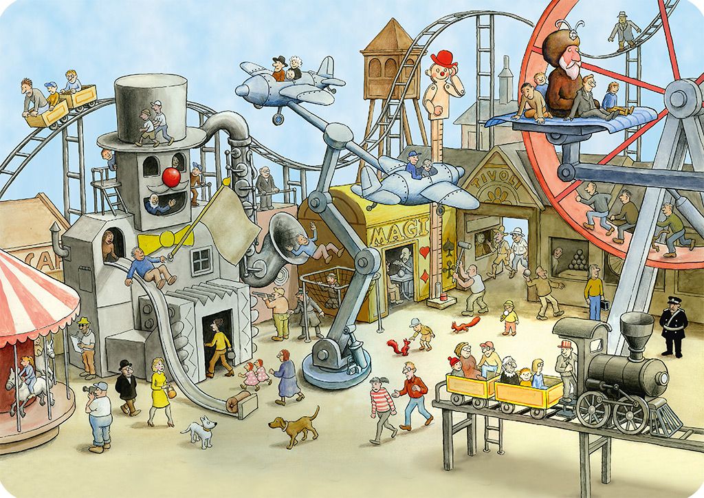 Ett underlägg som föreställer tivoli, fullt av roliga åkattraktioner och färgstarka detaljer. Mått: 42x30 cm. Perfekt för barn som älskar karuseller och tivolikänslan © Jan Lööf