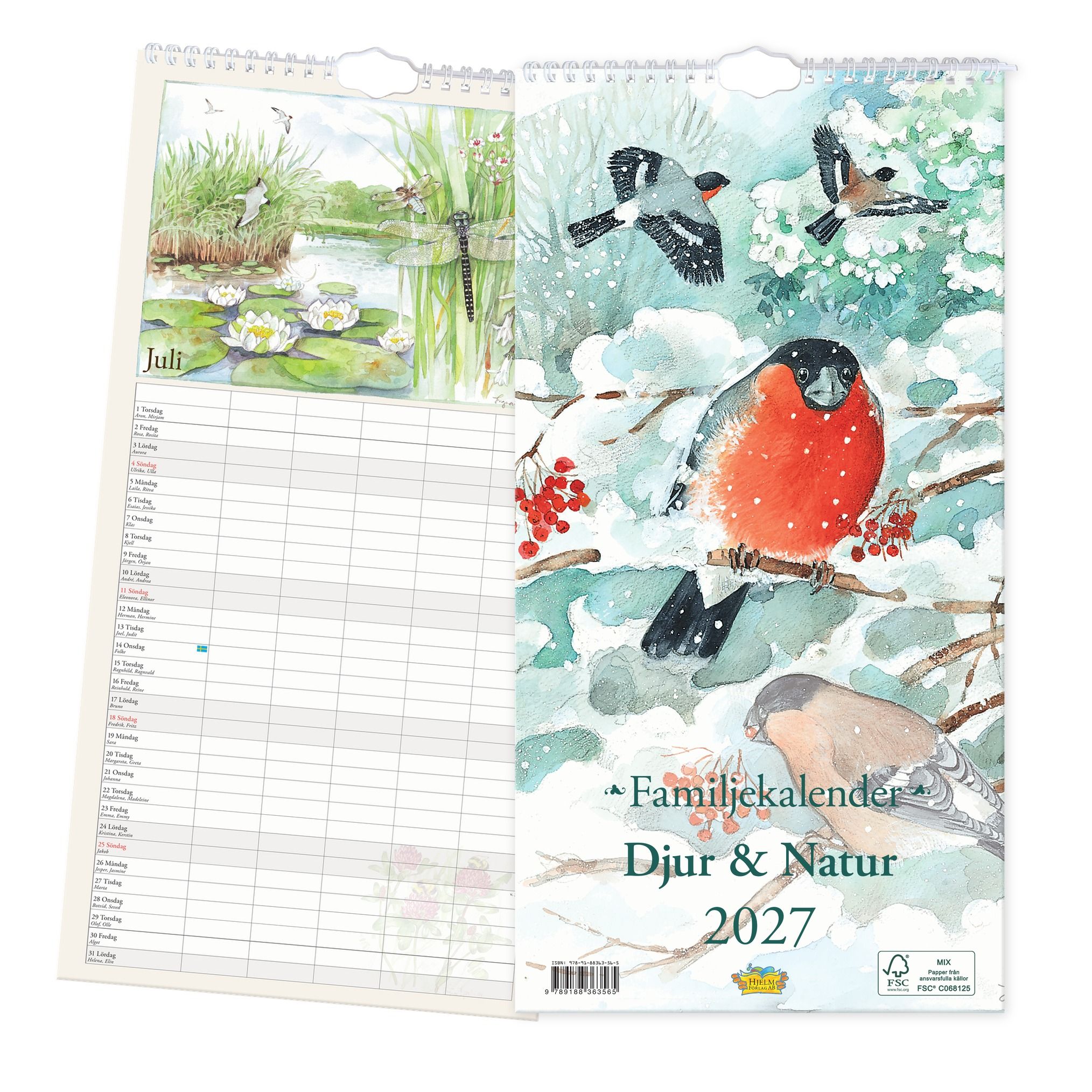 Domherrar i snöiga grenar, trollsländor vid näckrosdammen – årets naturkalender följer de svenska årstiderna med vackra akvarellillustrationer månad för månad. Stort format (220 × 430 mm) med kolumner för hela familjen, namnsdagar och röda söndagar. Spiralbunden med hålslag och tryckt på FSC-certifierat papper.
