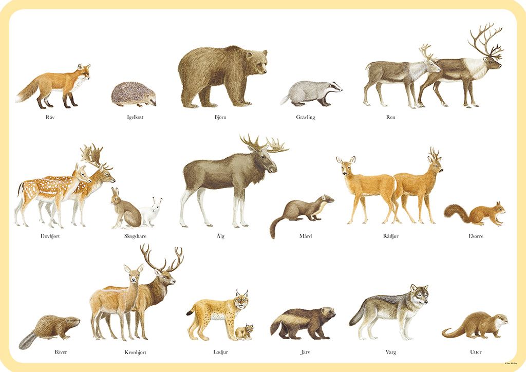 Ett pedagogiskt underlägg med illustrationer av svenska djur, skapade av Lars Klinting. Underlägget gör det enkelt för barn att känna igen vanliga djur från naturen, som björnar, älgar och rävar.