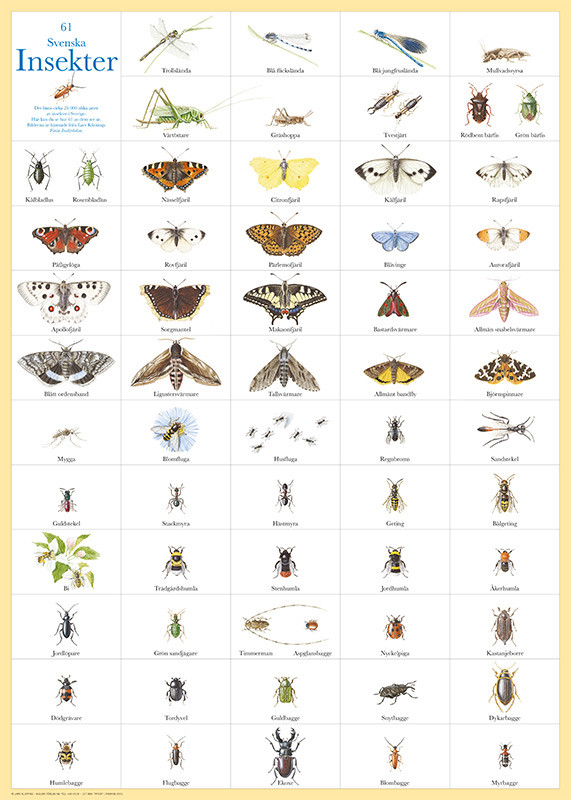 Svenska insekter är en informativ affisch som presenterar 61 av Sveriges vanligaste insekter, vackert illustrerade av Lars Klinting. Varje insekt är detaljerat avbildad med dess svenska namn angivet, vilket gör affischen till ett utmärkt verktyg för både undervisning och naturintresserade. Med måtten 50 x 70 cm passar den perfekt som dekorativ och pedagogisk väggprydnad i skolor, hem eller naturcentra. Affischen är tryckt på högkvalitativt papper för att framhäva de klara färgerna och detaljerna i Klintings illustrationer. Den fungerar både som en lärorik resurs och en estetiskt tilltalande dekoration för alla som vill fördjupa sin kunskap om svenska insekter.