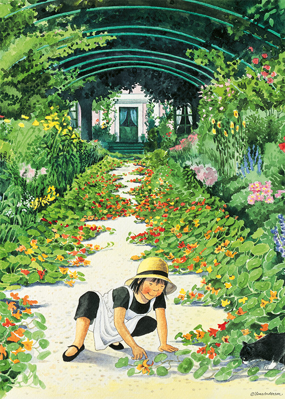 Linnéa i krassegången är en förtrollande affisch som fångar en scen från den älskade boken "Linnéa i målarens trädgård" av Christina Björk och illustratören Lena Anderson. Denna illustration visar Linnéa när hon utforskar en lummig krassegång, omgiven av frodig grönska och blommor, vilket förmedlar en känsla av upptäckarglädje och naturens skönhet.