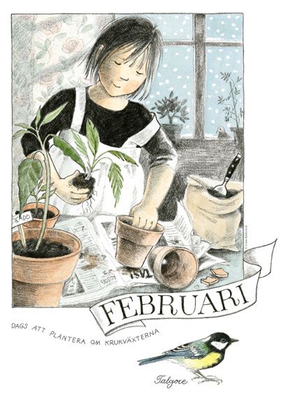 Illustrationen visar Linnea i ett vinterhem, omgiven av snöklädda träd och frostiga detaljer, vilket framkallar en känsla av februaris kyliga men vackra atmosfär. Detaljerna och färgpaletten speglar månadens speciella karaktär. Av Lena Anderson.