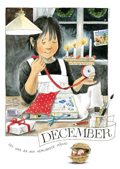 Bilden visar Linnea i en hemtrevlig miljö, omgiven av juldekorationer och vinterdetaljer, vilket framkallar en känsla av nostalgi och värme. Illustrationen är rik på detaljer och färger som speglar december månads unika karaktär. Av Lena Anderson.