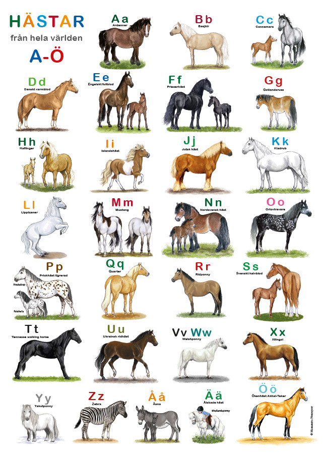 Hästar ABC-affischen av Margareta Nordqvist är en pedagogisk och estetiskt tilltalande illustration som kombinerar alfabetets bokstäver med olika hästraser från hela världen. Med måtten 50 x 70 cm är den idealisk för att dekorera barnrum eller klassrum, och inspirerar till både språkinlärning och ett intresse för hästar.