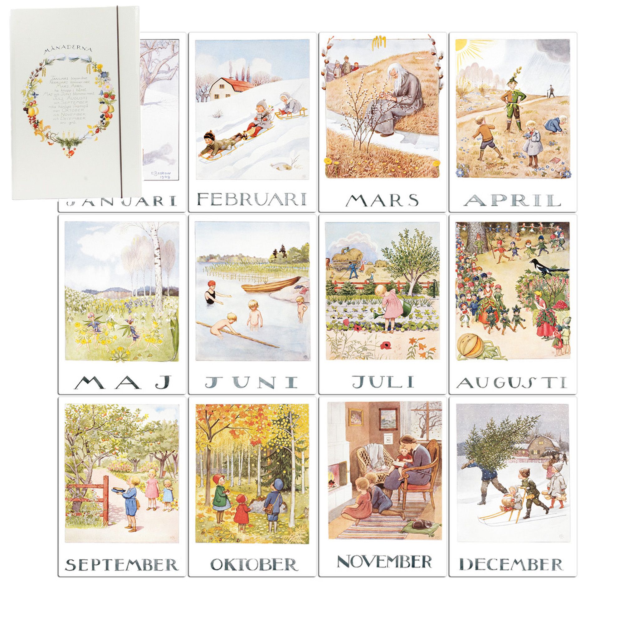 Gummibandsmapp innehållande 12 månadsbilder med bilder av Elsa Beskow. Motiven tagna från Årets saga. A4-format