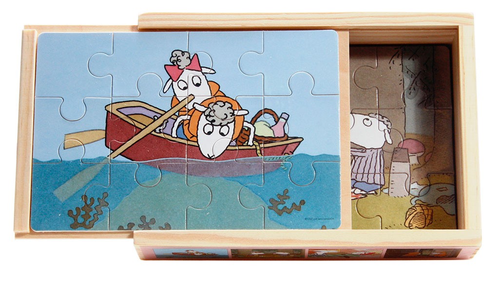 "Bu och Bä 4 x träpussel" – en trälåda som innehåller fyra 12-bitars träpussel med charmiga motiv av de älskade fåren Bu och Bä, skapade av Olof och Lena Landström. Varje pussel mäter 12 x 17 cm.