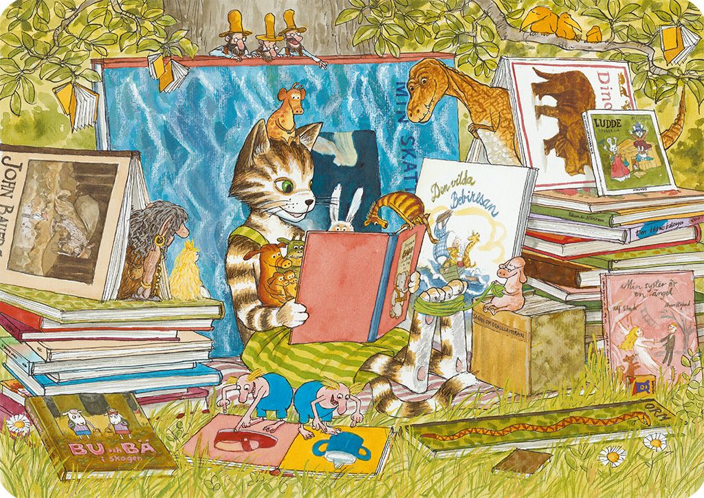 Findus sitter och läser en bok i detta underlägg, vilket reflekterar den pedagogiska och underhållande sidan av Sven Nordqvists Pettson och Findus-värld.