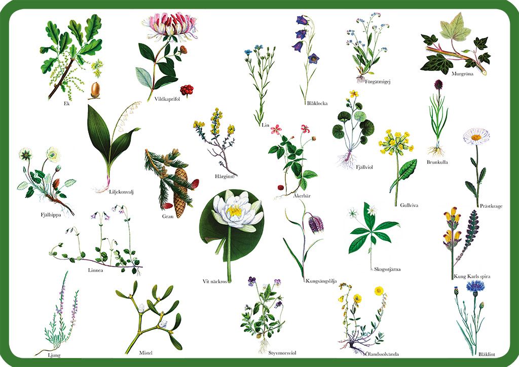 Ett underlägg med blommor från Sveriges olika landskap, perfekt för att lära barn om naturen och geografi. Mått: 42x30 cm. Ett vackert sätt att presentera Sveriges flora och landskap för unga sinnen. © Jonas Hjelm och J.W. Palmstruch